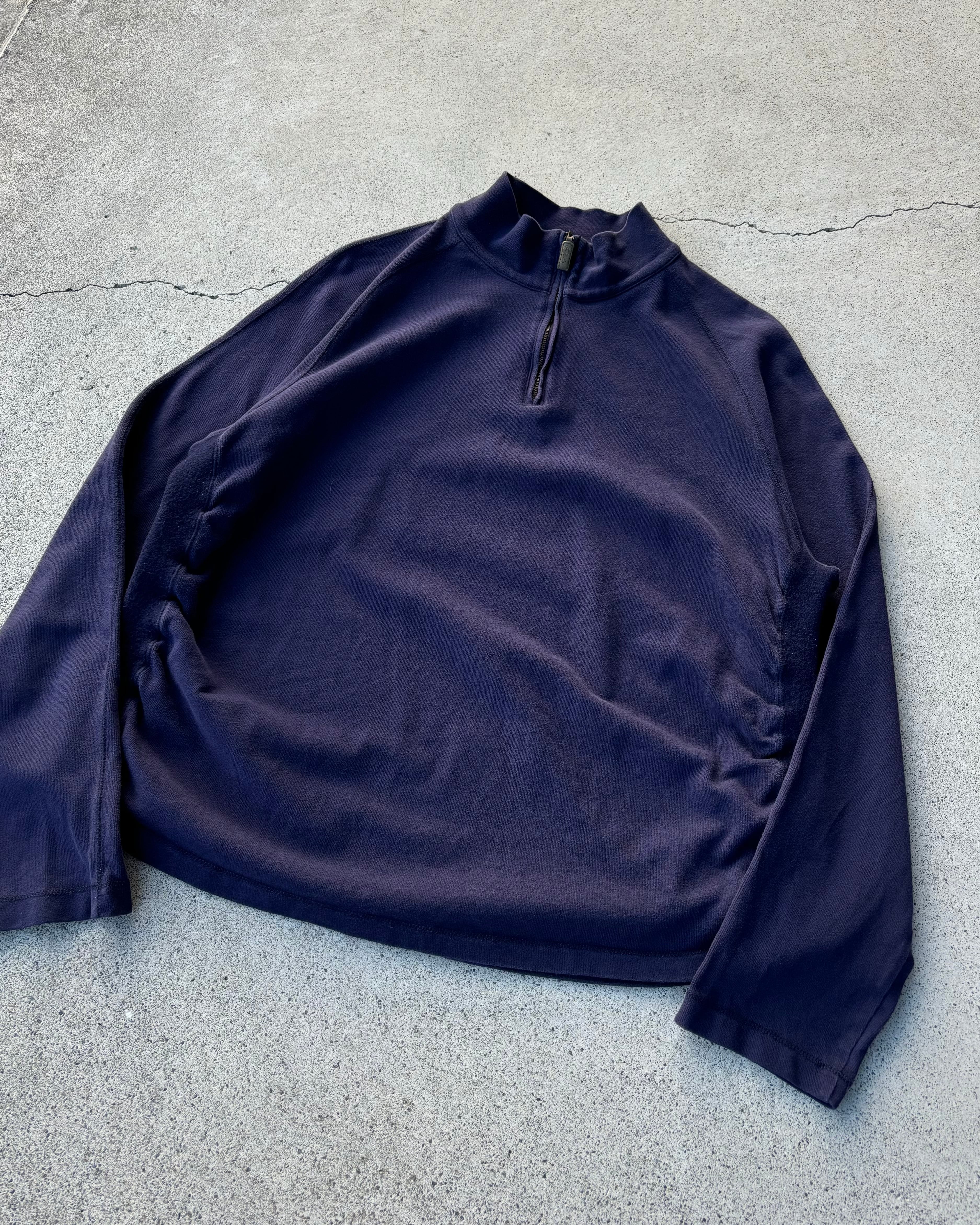 ハーフジップで、上質なコットン生地、大人なダークネイビーで、短丈よりのボックスシルエットと至れり尽くせりの至高の一着。